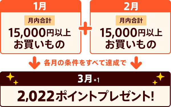 | キャンペーン期間中にエントリーのうえ、2022年1月・2月の2か月連続で、同月内の商品代金の合計金額が15,000円(税込)以上のお買い物をしていただいた方 |