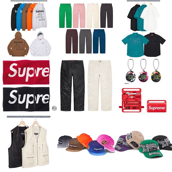 その他にはパッチワークレザーカーゴベスト&5ポケットパンツ、ホームツール(Home Tool)の略語に由来するHOTO社製ツールセット、メイドインジャパンの今治ポケットタオル2枚セット、1996年に登場したバンダイのキーチェーンタイプ電子ゲーム・キャラクター『たまごっち(Tamagotchi)』とのコラボたまごっちなどもリリース予定。たまごっちには象徴的なSupreme Box Logoが配され、3色のカモフラパターンで展開予定だ。