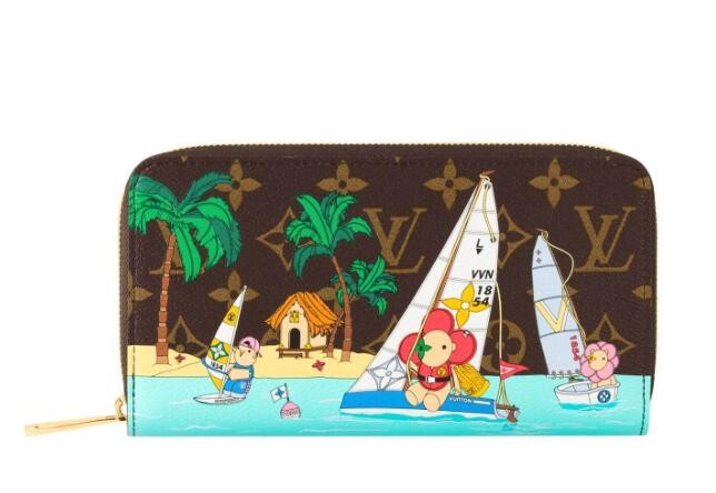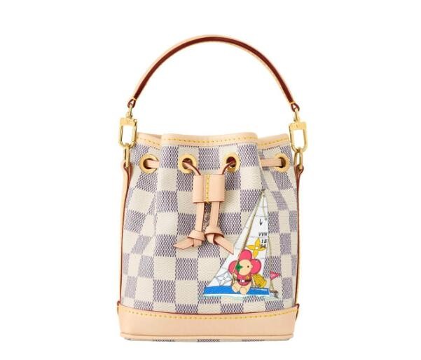もうひとつのデザインは、南国のビーチでセーリングする「ヴィヴィエンヌ」と仲間たち。ダミエ・アズール キャンバスをベースに、ヨットや椰子の木などのモチーフが描かれている。