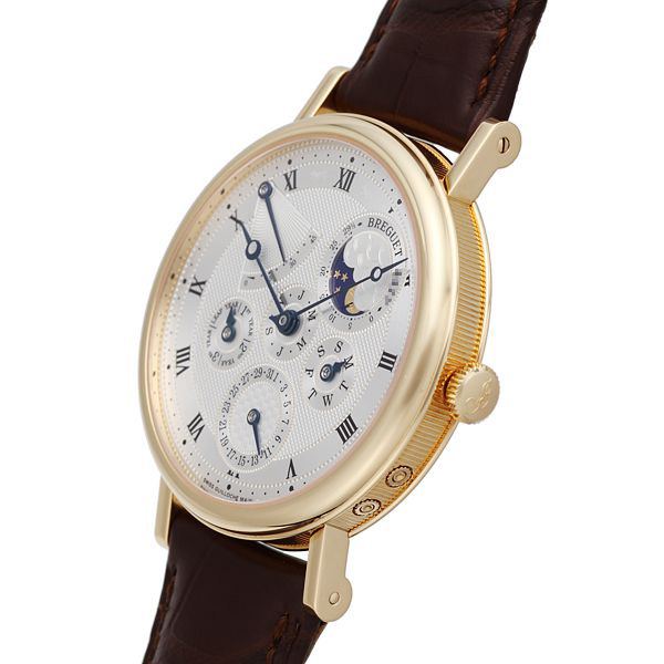 ブレゲの技術、芸術性、伝統的な価値を忠実に再現したクラシック・コレクションに属するこちらのモデル。手彫り装飾されたフェイスには、パーペチュアル・カレンダー、デイデイト、月、閏年表示、ムーンフェイズ、パワーリザーブインジケーターを備えます。心臓部には45時間パワーリザーブのブレゲ自社製自動巻きムーブメント502.3 DRP1を搭載します。ケースサイドにはブレゲ特有のコインエッジ装飾が愉しめます。