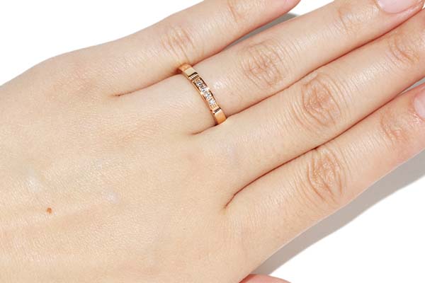 シンプルながらもダイヤが4p入っていて、上品さを感じさせるデザインのリングです。重ね付けなども出来そうです