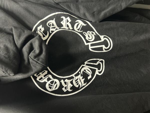 「クロムハーツ」と描かれたホースシューのロゴが堂々とバックプリントされている、一目でクロムハーツだと分かるデザイン。