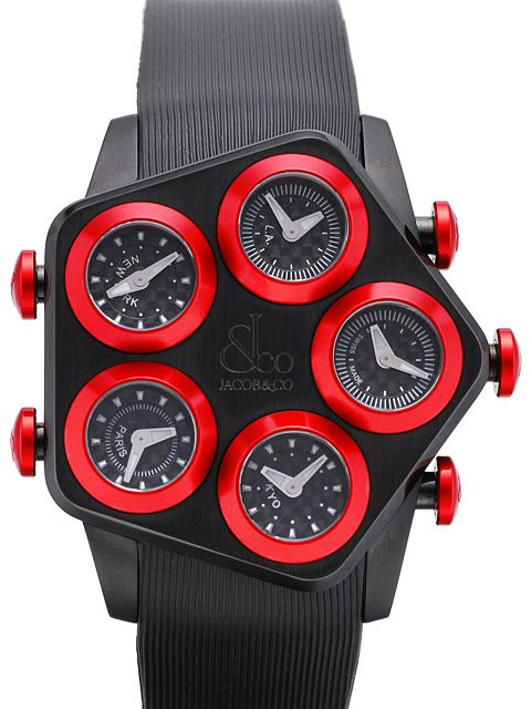 世界5ヶ国の時刻を同時に表示 ブラック&レッドPVD加工ケース カーボン文字盤