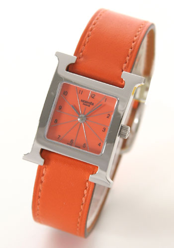エルメスの頭文字である【H】をモチーフにしてデザインされたフォルム。鮮やかなオレンジ文字盤の中央から放射線状に鋭く放たれたラインが神秘的。
