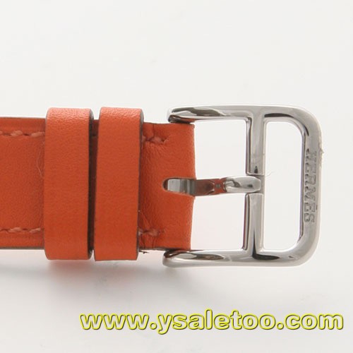 エルメスの革へのこだわりが感じられるオレンジのレザーベルト。6段階の腕周り調節が可能でバックルにはエルメスのロゴが刻印。